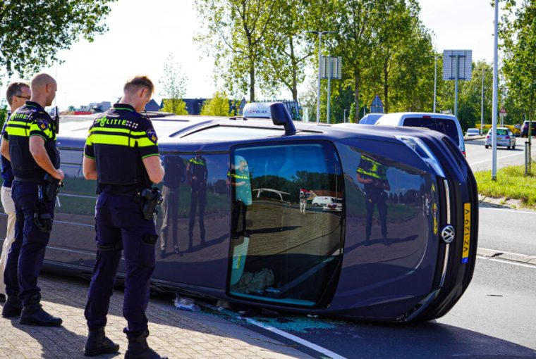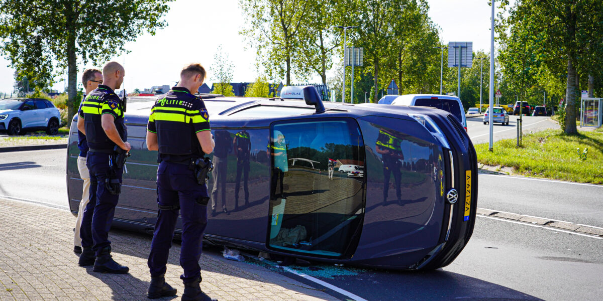 Een bestelbus is woensdagmiddag rond 13.45 uur op zijn kant beland bij een aanrijding op de Persant Snoepweg in Leiderdorp.