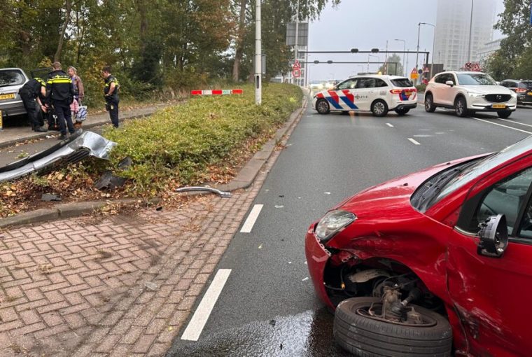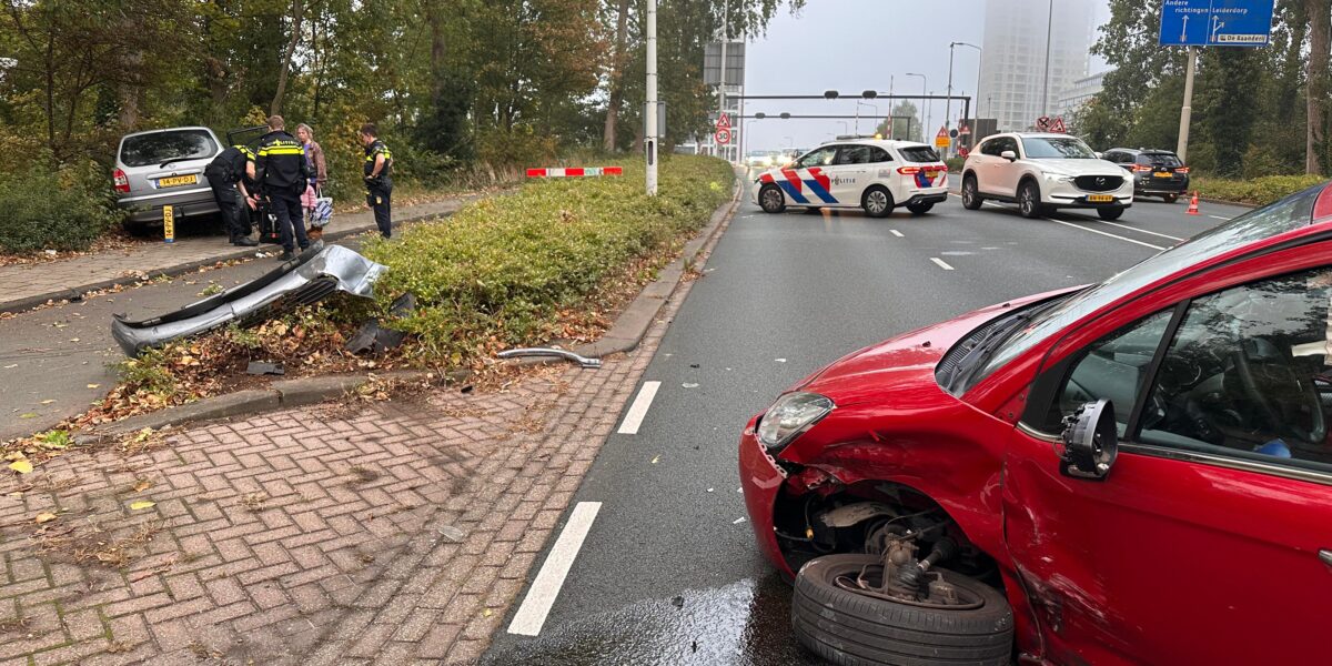 Twee auto’s zijn dinsdagochtend met elkaar in botsing gekomen op de Willem de Zwijgerlaan in Leiden. Een van de voertuigen belandde daarbij in de bosjes naast het fietspad, bij de andere auto brak een wiel af.