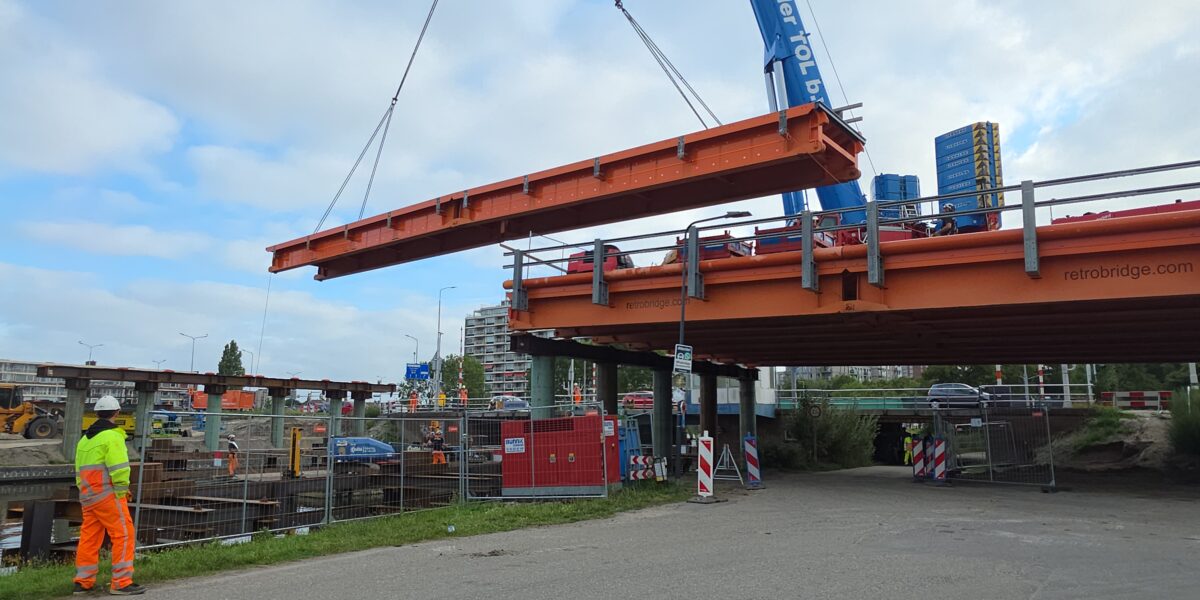 Vanaf 8.30 uur werd de ene na de andere stalen strook op z’n plek gelegd, waarna ze boven het water aan elkaar worden geklonken. Gezamenlijk vormen ze de tijdelijke brug die het verkeer de komende jaren gaat afwikkelen.