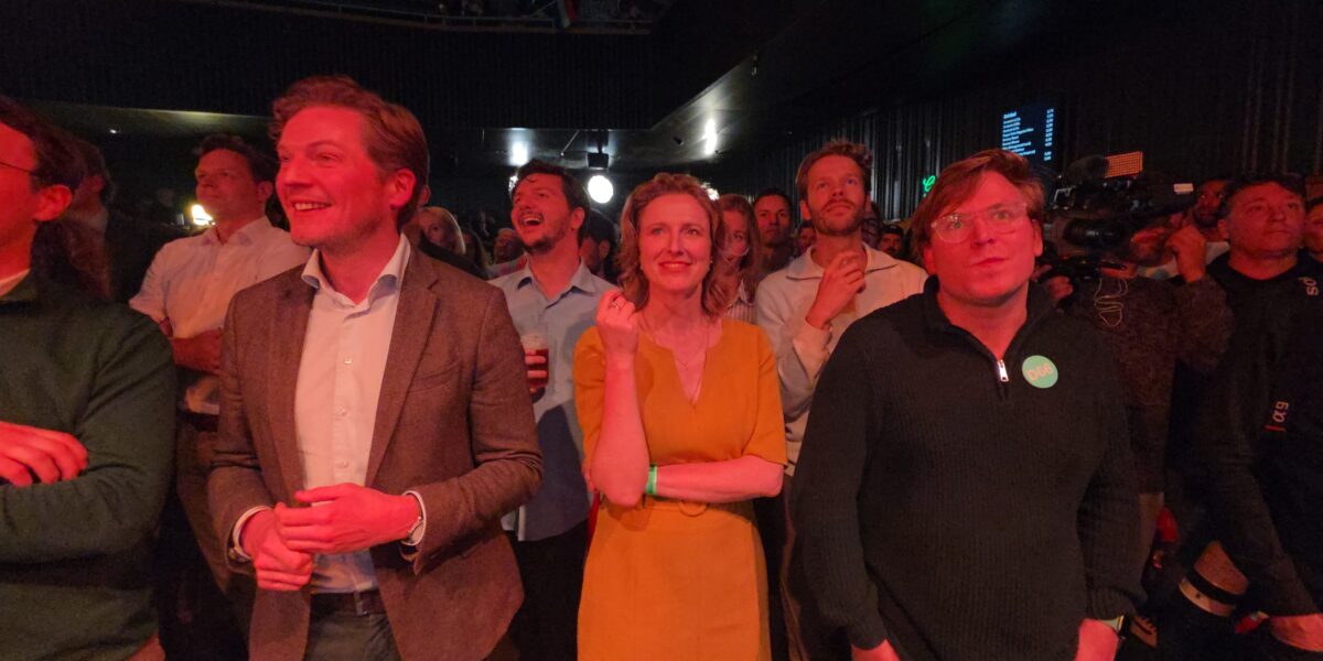 D66-wethouder en lijsttrekker voor de gemeenteraadsverkiezingen volgt de uitslagen vanuit poppodium Nobel samen met fractievoorzitter Sander van Diepen. (Foto: Chris de Waard)