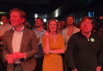 D66-wethouder en lijsttrekker voor de gemeenteraadsverkiezingen volgt de uitslagen vanuit poppodium Nobel samen met fractievoorzitter Sander van Diepen. (Foto: Chris