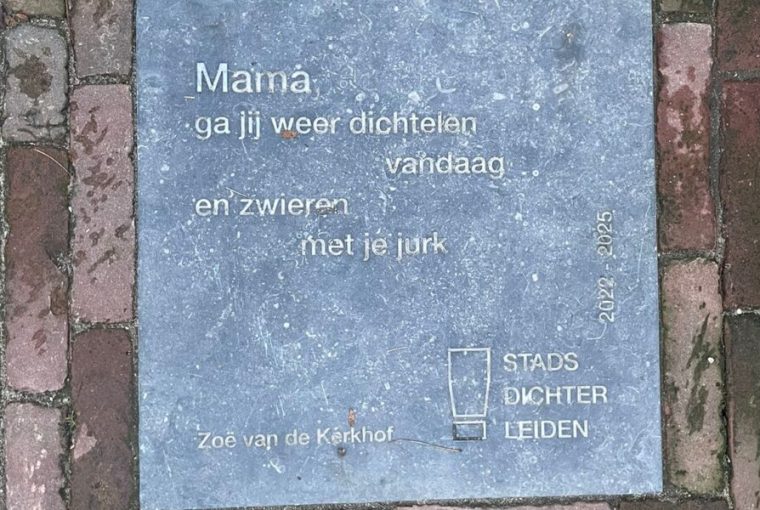 Voor de deur van de woning van Zoë van de Kerkhof is afgelopen vrijdagmiddag een steen onthuld ter ere van haar stadsdichterschap. Van de Kerkhof mocht zich van april 2022 tot en met april 2025 stadsdichter van Leiden noemen.