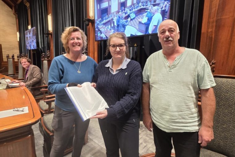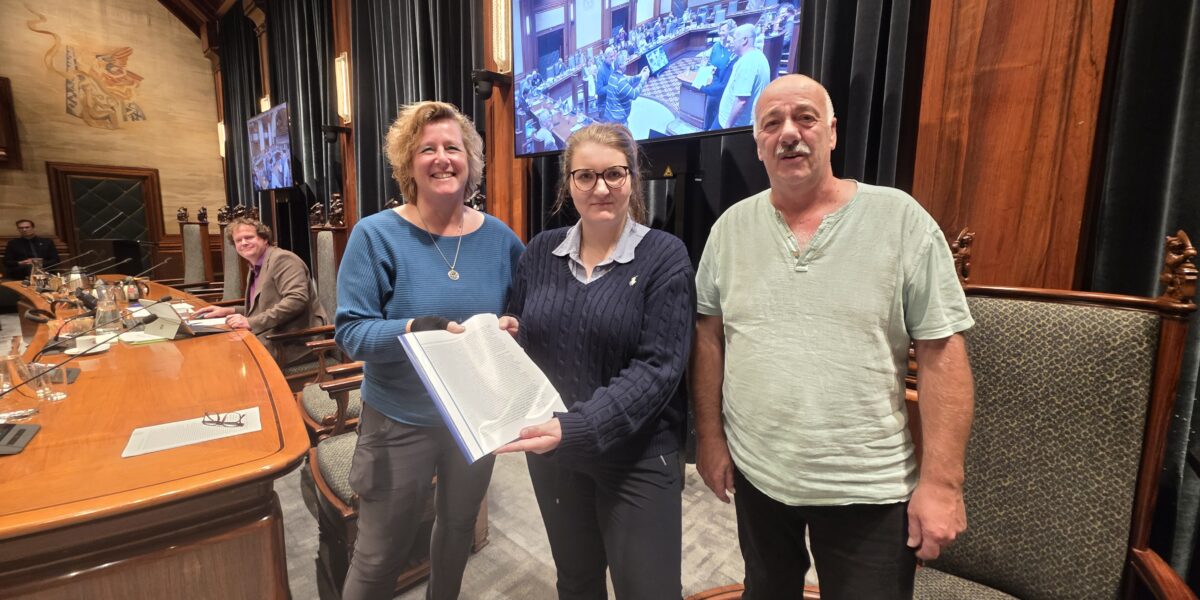 Cor en Esther de Ruijter hebben hun petitie tegen de afsluitingen op de Jan Luykenlaan en de Vierlinghlaan aangeboden aan de Leidse gemeenteraad. Voorzitter Bo Lemmens van de raadscommissie Leefbaarheid en Bereikbaarheid nam de 2.600 handtekeningen tegen de verkeersknips in ontvangst.