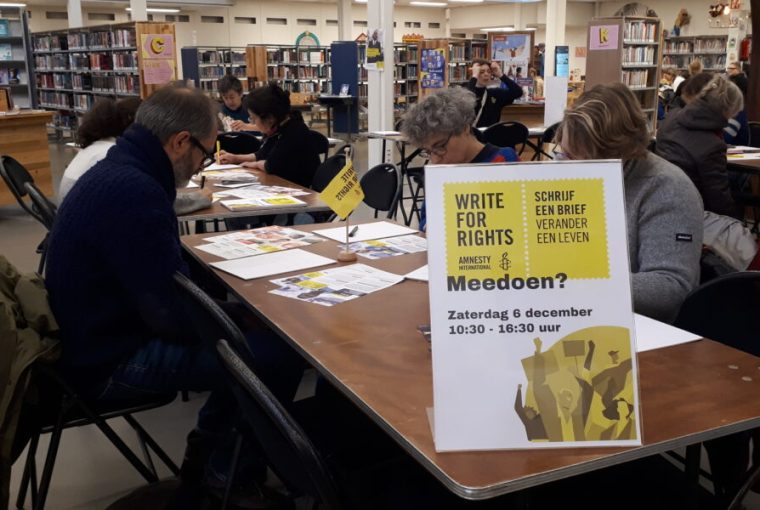 “Ik heb een brief geschreven voor jonge vrouwen in Ecuador die actie voeren tegen de olie- en gasindustrie”, zegt wethouder Abdelhaq Jermoumi als hij zaterdag 6 december naar de bibliotheek in de Leidse Nieuwstraat komt voor de jaarlijkse schrijfactie van Amnesty International Write for Rights. “Echt goed dat inwoners van Leiden en Leiderdorp dit doen.”