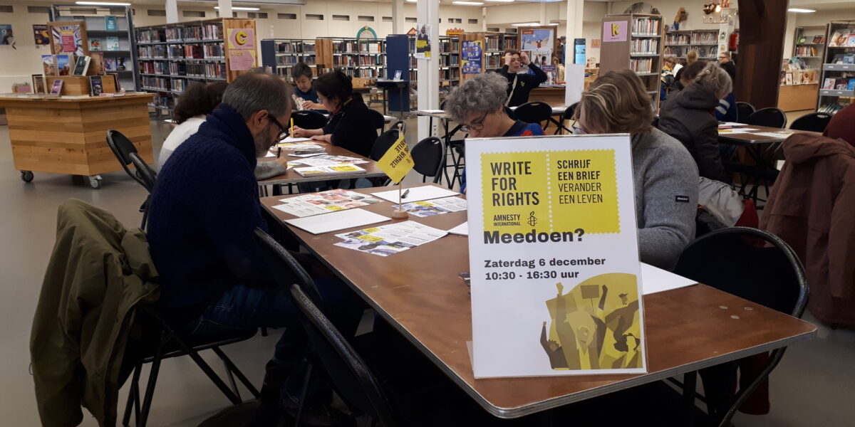 In de bibliotheek in de Leidse binnenstad schreven mensen brieven en kaarten om politieke gevangenen wereldwijd te helpen. (Foto’s: Ine Wiersma)