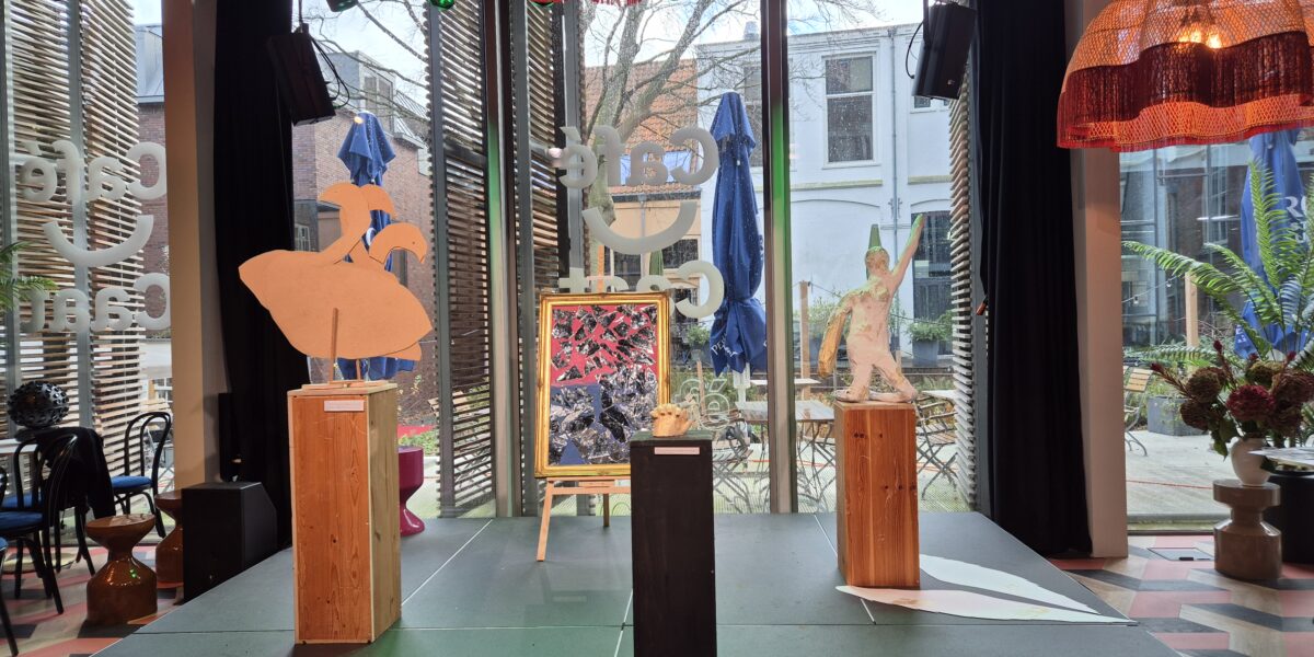 Kunsttentoonstelling in een café met ramen, beelden, een schilderij en uitzicht naar buiten. (Foto: Lisanne de Vries)