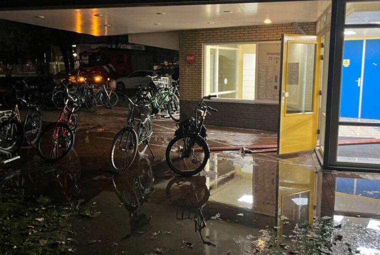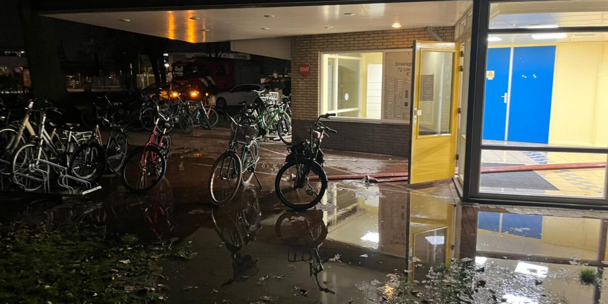 Veel wateroverlast bij een appartementencomplex aan de Smaragdlaan in Leiden zaterdagavond. Door een lekkage kwamen zo’n vijftien woningen deels onder water te staan.