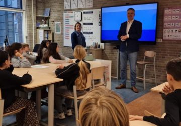(Foto: Jan Frensen) Hoog bezoek aan de Lucas van Leydenschool locatie Steeg aan de St. Ursulasteeg in Leiden vrijdagochtend. Daar