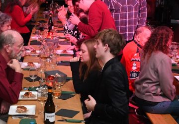 Studenten en mensen van de voedselbank tijdens het diner (Foto’s: Emile van Aelst) Leden van Studentenvereniging SIB Leiden organiseerden maandagavond