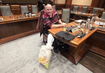Tijdens de commissiebehandeling nam duoraadslid Marcel Mioch van de Partij Sleutelstad een confettikanon mee. Het gebruikte het uiteindelijk niet. (Foto: