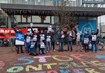 (Foto en video: Jan Frensen) Demonstranten van vakbond FNV en actiegroep Doorbraak hebben vrijdagochtend actie gevoerd voor de Albert Heijn