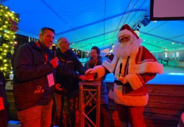 Met een druk op de knop werd het openingsfilmpje gestart op het grote scherm boven de ijsbaan. (Foto’s: Chris de