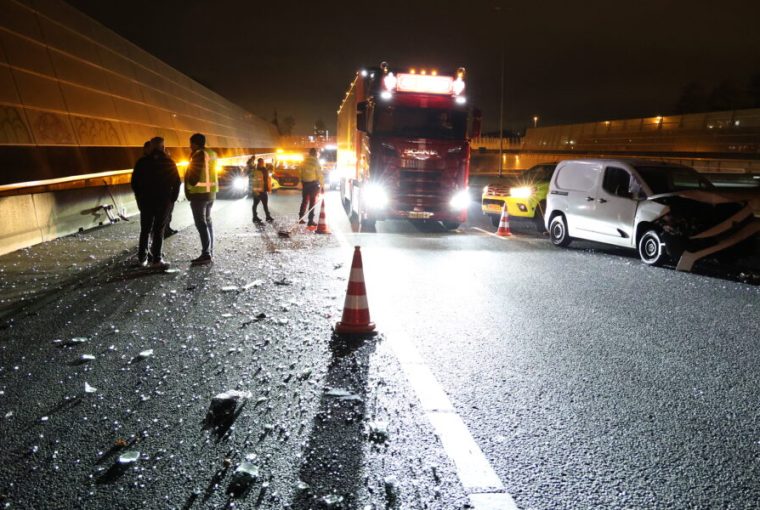 De A4 bij Leiderdorp was enige tijd volledig afgesloten vanwege een ongeval tussen vier voertuigen én de rijbaan welke volledig bezaaid was met glas.