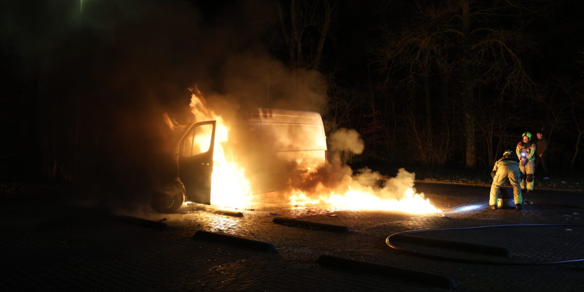 Een geparkeerde PostNL bestelbus ging op de parkeerplaats van de Houtkamp aan de Engelendaal in Leiderdorp in vlammen op. (Foto: Regio15)