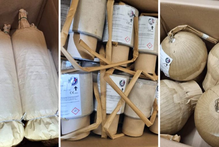 Een deel van het vuurwerk dat vrijdag is aangetroffen in Roelofarendsveen. (Foto: Openbaar Ministerie)
