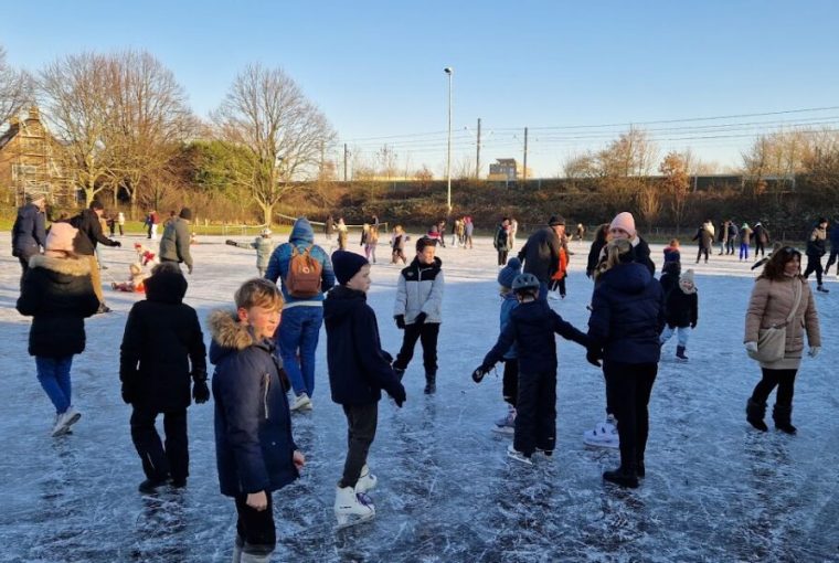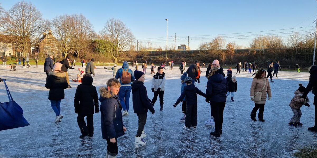 De skeelerbaan van de Vereniging IJssport Leiderdorp is vorige week onder water gezet. Er ligt inmiddels een laag ijs op bijna de hele baan, maar die is nog niet dik genoeg om op te kunnen schaatsen. De vereniging durft nog niet te voorspellen wanneer er wel kan worden geschaatst bij het Weteringpark.