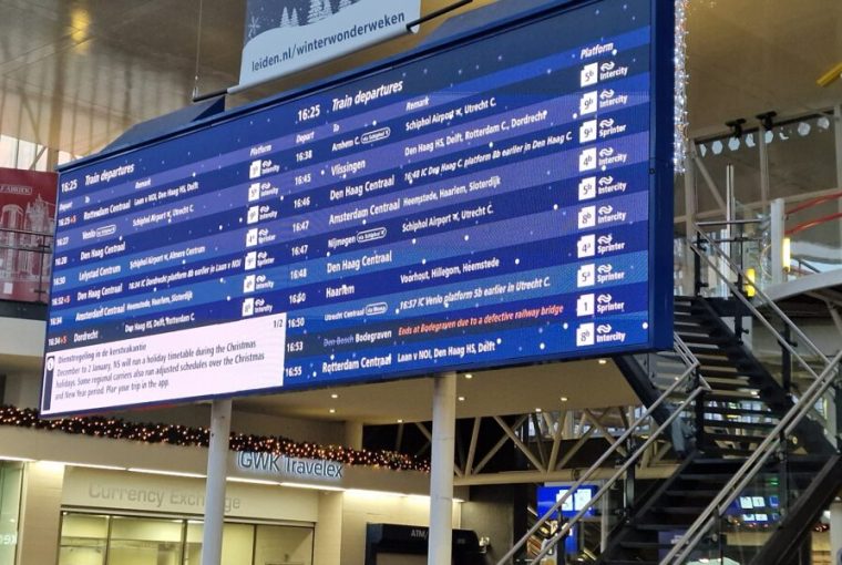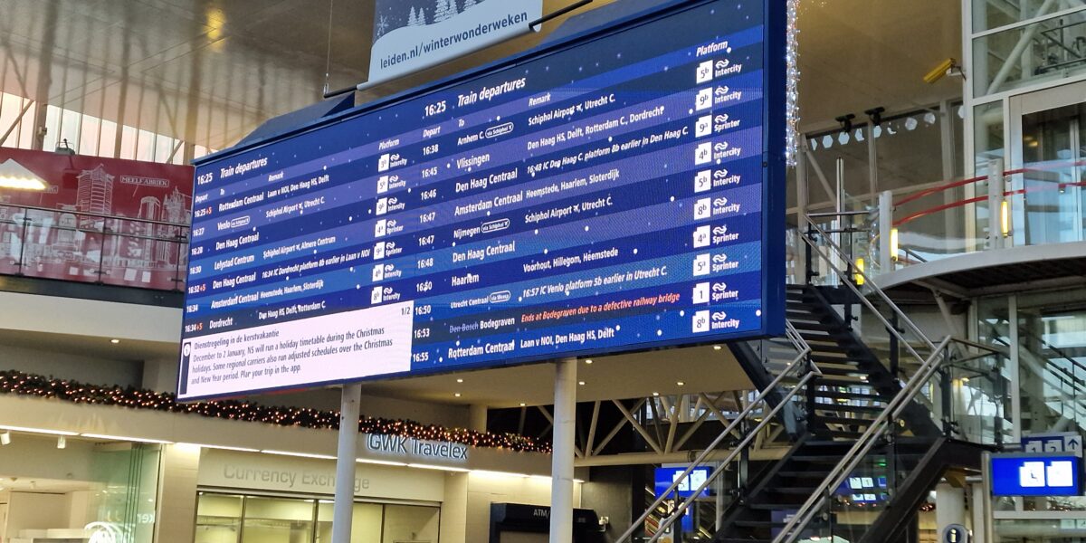 Daar hebben de reisinformatieborden namelijk een winterse gedaante aangenomen. Op de schermen is nu niet alleen te zien of een trein geannuleerd of vertraagd is, maar valt ook vallende sneeuw te zien.