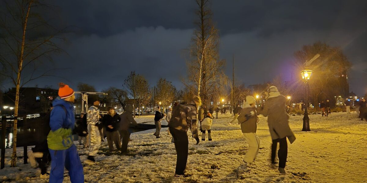 Het was woensdagavond met recht een sneeuwballenfestijn in het Huigpark in Leiden. Toevallige voorbijgangers moesten oppassen niet geraakt te worden door rondvliegende sneeuwballen. Een dikke honderd mensen kwamen samen om van de laatste sneeuw te genieten door een groot sneeuwballengevecht te houden.