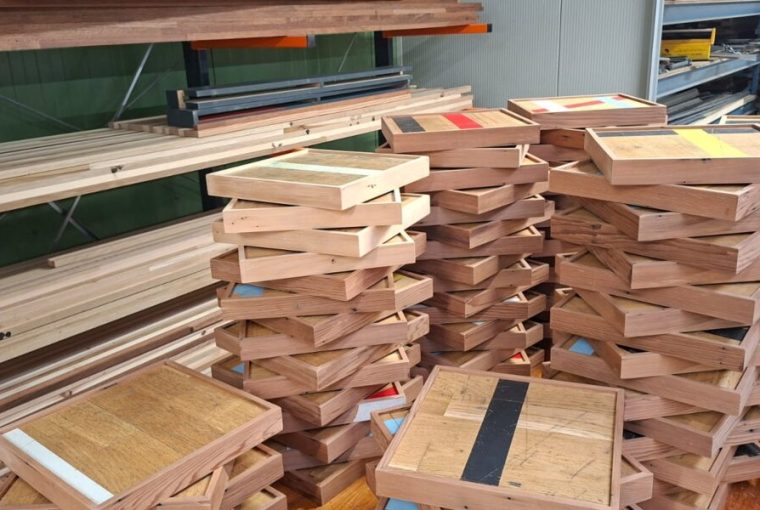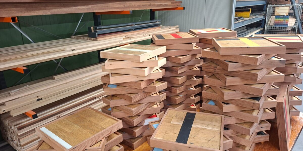Ongeveer vijf maanden geleden tijdens het leeghalen zijn stukken van de vloer naar De Zijlbedrijven (DZB) gestuurd. Daar zijn ze in stukken van dertig bij dertig centimeter gezaagd en vervolgens ingelijst. Op de houten lijst staat  ‘5 Meihal – Leiden 1968 – 2023’ gebrandmerkt.