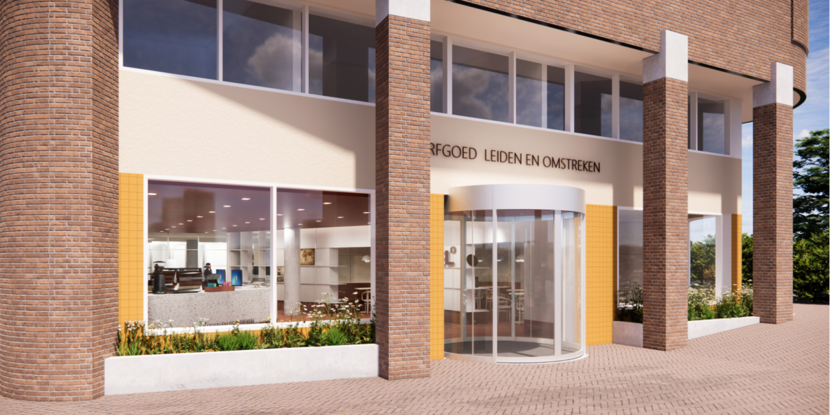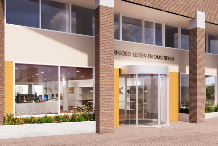 Toekomstige voorgevel van Erfgoed Leiden en Omstreken met entree. (Afbeelding: Studio Groen + Schild)