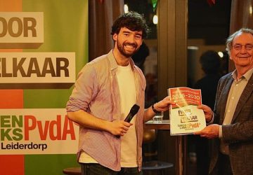 Lijsttrekker Sem Overduin overhandigt het verkiezings-programma van zijn partij aan Hein van der Zande. (Foto: GroenLinks-PvdA Leiderdorp) Tijdens de feestelijke