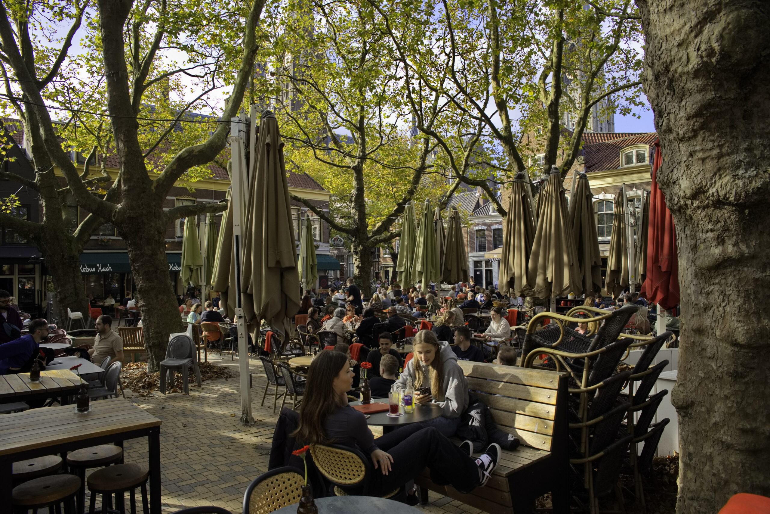 De Beestenmarkt in Delft dient in de rapportage als voorbeeld voor de optie waarbij op het plein ook veel bomen zouden worden aangeplant. (Foto: Reinout van Gulick)
