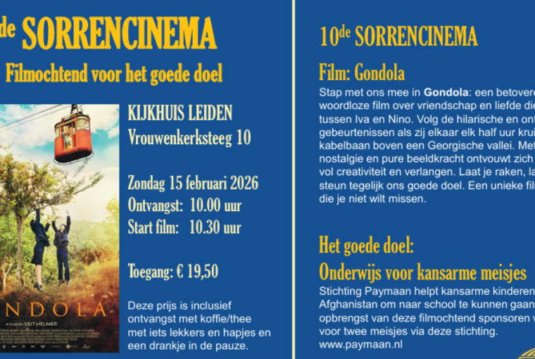 Soroptimistclub Leiden Aurora organiseert zondagochtend 15 februari alweer de tiende Sorrencinema in het Kijkhuis in Leiden. Het is een filmochtend waarbij de opbrengst bestemd is voor een goed doel.