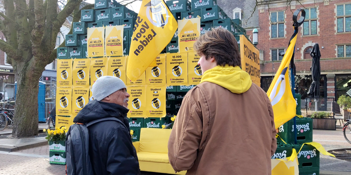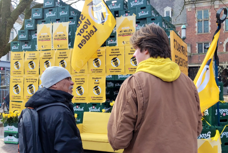 Studentenpartij Studenten Voor Leiden (SVL) heeft woensdag voor het stadhuis van Leiden een studentenkamer gebouwd van zo’n 350 bierkratjes. Dat deed de partij om aandacht te vragen voor het tekort aan studentenkamers.