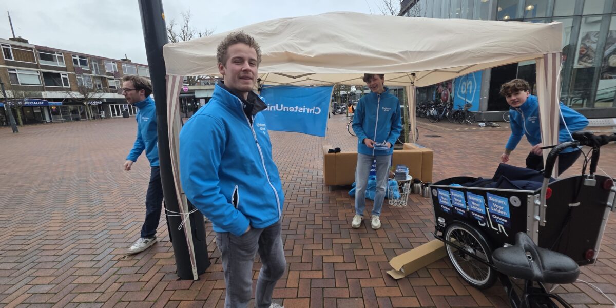 Met een geleend bankstel van de kringloop, een partytentje en potten vol koffie van de Herensingelkerk weerstonden een aantal kandidaten van de ChristenUnie Leiden zaterdag op het Bevrijdingsplein de weergoden.