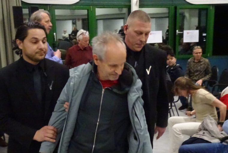 Actievoerders tegen deelname van FVD werden een voor een de zaal uitgezet. (Foto’s/video: Chris de Waard)