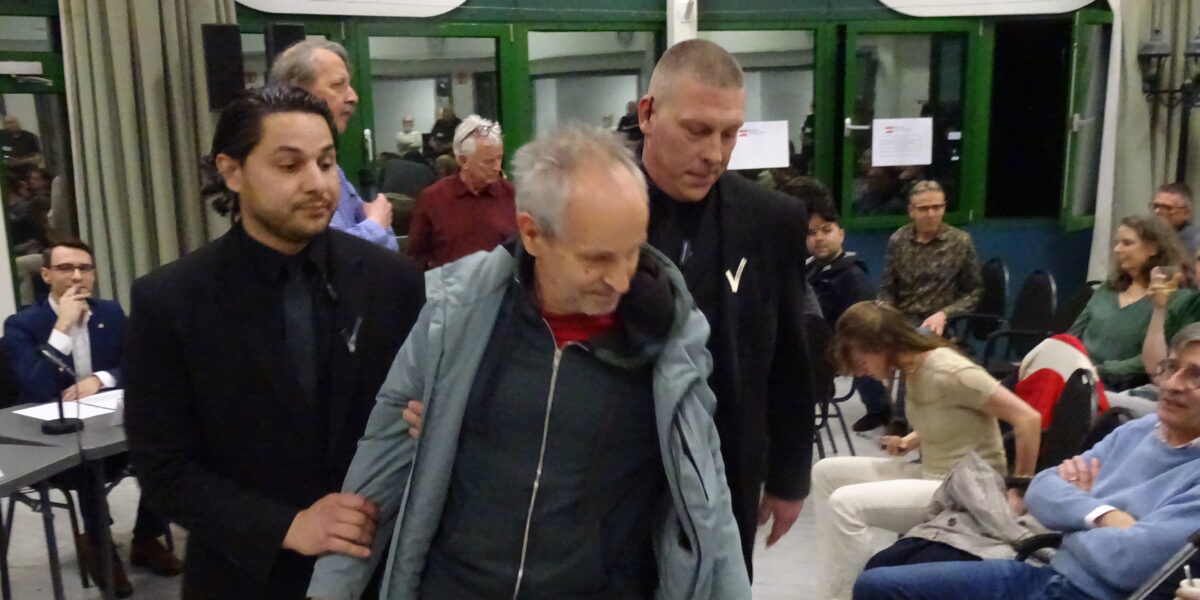 Actievoerders tegen deelname van FVD werden een voor een de zaal uitgezet. (Foto’s/video: Chris de Waard)