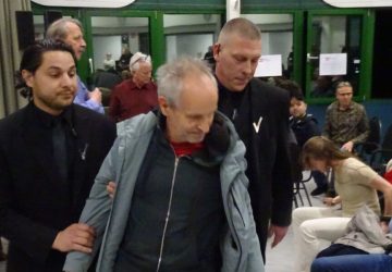 Actievoerders tegen deelname van FVD werden een voor een de zaal uitgezet. (Foto’s/video: Chris de Waard) De Wijkraad Stevenshof had