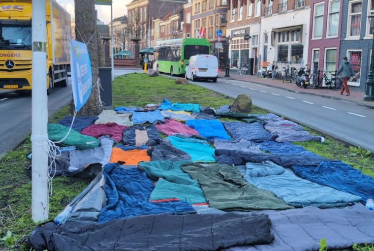 Het Kort Rapenburg in Leiden lag maandagochtend vol met slaapzakken. Die waren daar door de ChristenUnie Leiden neergelegd. De slaapzakken dienen als symbool van het aantal daklozen in de stad.