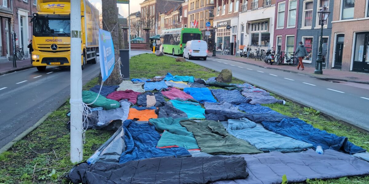 Het Kort Rapenburg in Leiden lag maandagochtend vol met slaapzakken. Die waren daar door de ChristenUnie Leiden neergelegd. De slaapzakken dienen als symbool van het aantal daklozen in de stad.