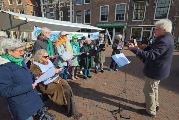 Het Klimaatkoor Leiden van de Grootouders voor het Klimaat heeft een speciaal lied geschreven voor de gemeenteraadsverkiezingen. Tussen de campagnevoerende politieke partijen werd het zaterdag uitgevoerd in het centrum van Leiden.