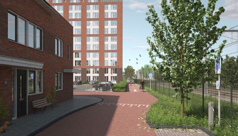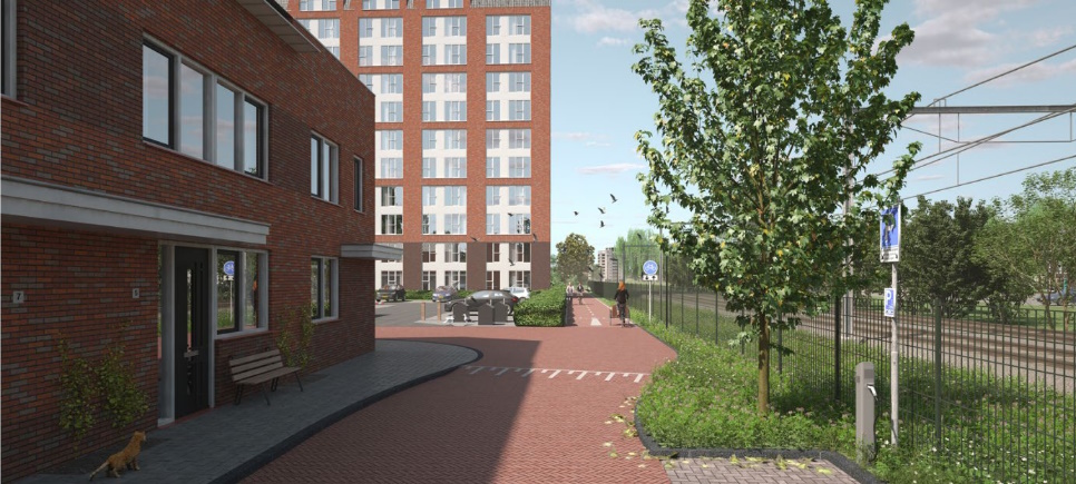 Tussen het spoor en appartementengebouw de Verleyding wordt het fietspad doorgetrokken. (Afbeeldingen: Gemeente Leiden)