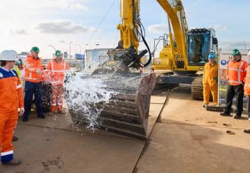 Het dopen van de eerste bouwkraan door directieleden van WarmtelinQ en de betrokken aannemers. (Foto: Vincent Basler) Leiden, 13 maart