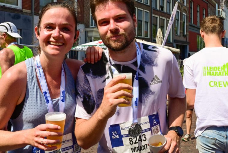 Normaliter krijgt een sporter een glas koud water na een langdurige inspanning, maar bij de Leiden Marathon is dat al jaren een glas koud bier. “Het gaat wel om alcoholvrij bier, vertelt Anoushka Berbee van het Marathon Bureau. Maar het is voor de lopers echt dé beloning na 42, 21 of 10 kilometer. Dat moment dat je moe, trots en met een glimlach over de finish komt, is voor veel deelnemers misschien wel het mooiste moment van de dag.”