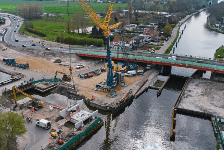 De nieuwe Knotterpolderbrug is niet zomaar doorsneebrug, maar een zogeheten hangduiker. Dat is een slimme onderwaterconstructie die de Vrouwenvaart kruist. De betonnen elementen rusten op een stevige draagbalk, ondersteund door gefundeerde palen.