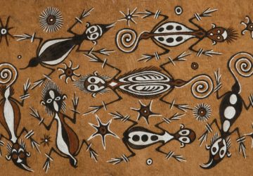 Boombastdoek of maro, gemaakt door kunstenaar Agus Ongge (1954) uit het Sentanimeer-gebied, de geboortestreek van Gershon Kaigere. De hagedisachtige (voorouder)figuren