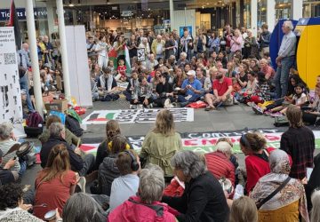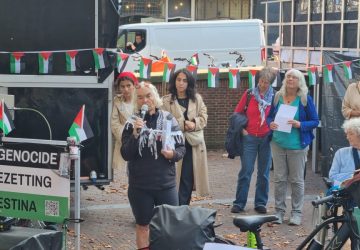 Met een sit-in bij station Leiden Centraal wordt dinsdagavond door de Leiden Palestina Coalitie (LPC) stilgestaan bij de Gaza-oorlog. Het is