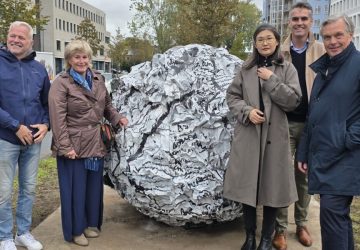 (Foto’s: Chris de Waard) Het kunstwerk ‘The fire in my mind’ van Natalia Papaeva is maandagmiddag onthuld op het Schuttersveld