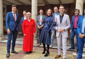 In het rood Yvonne van Delft in 2022 bij de presentatie van het huidige coalitieakkoord in de Lakenhal. (Foto: Chris