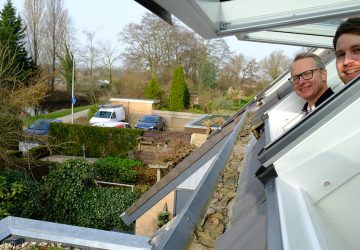 Wethouder Hubert Schokker bekeek vrijdag een van de eerste resultaten: een groen dak in de wijk Noord-Hofland. (Foto: Gemeente Voorschoten)