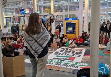 (Foto’s: Jan Frensen) In de stationshal van Leiden Centraal deden dinsdag 7 oktober enkele tientallen demonstranten mee aan een protest